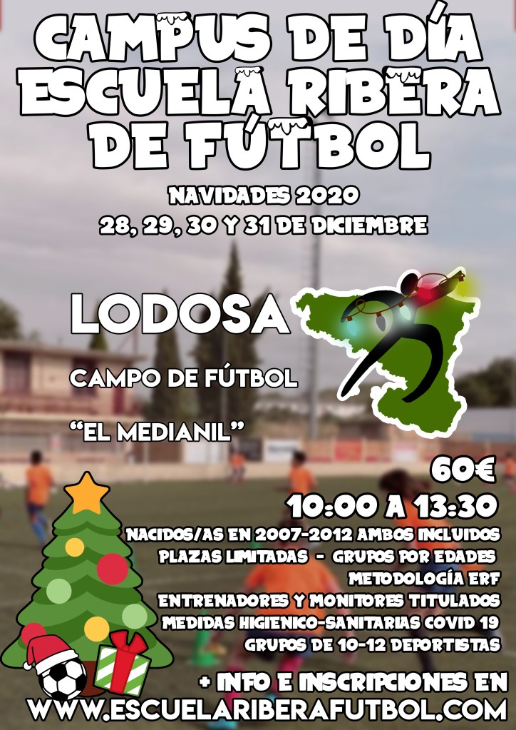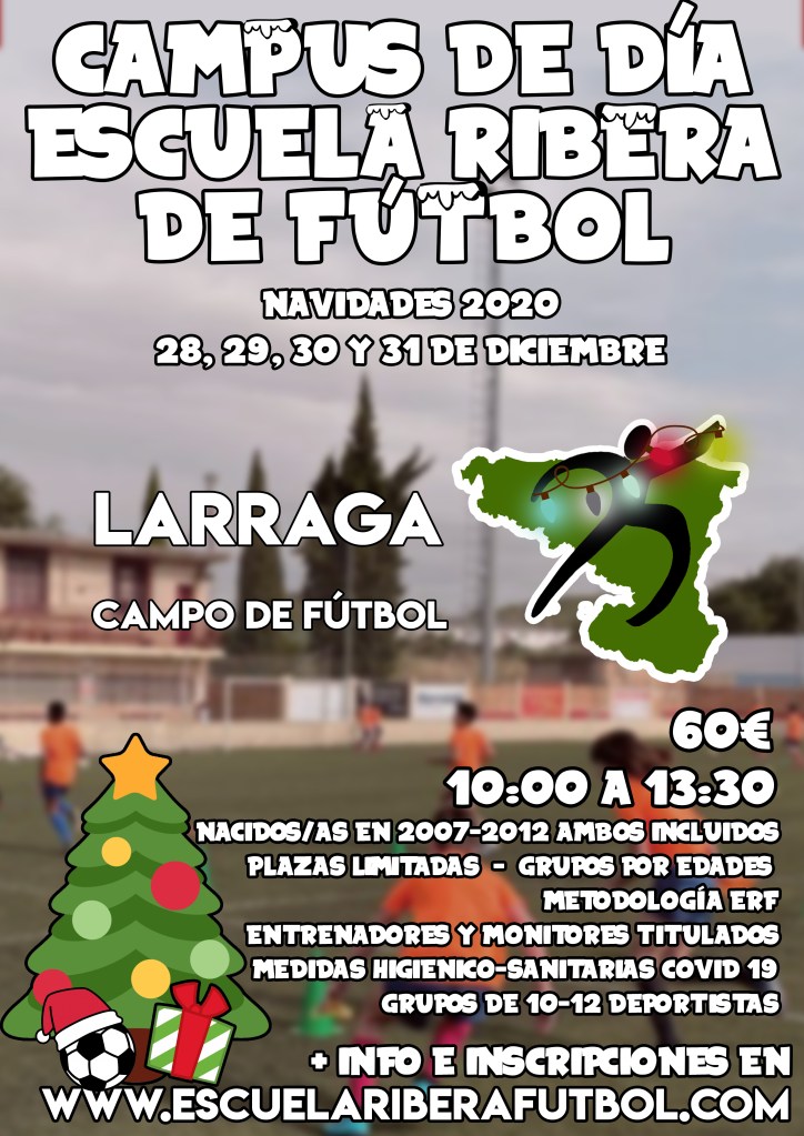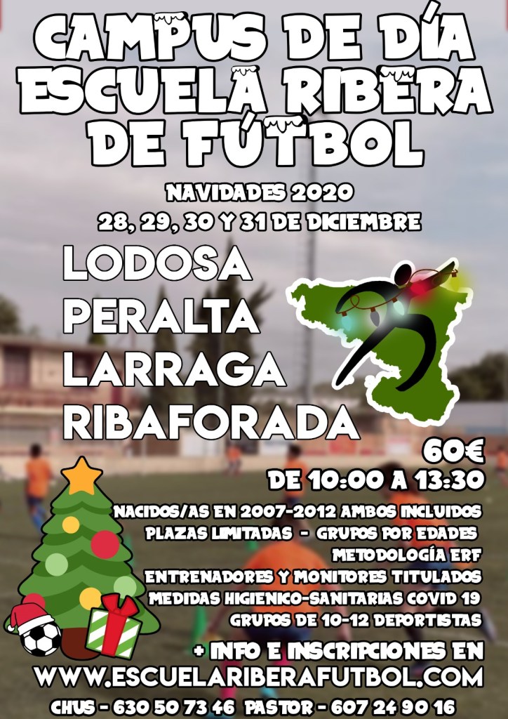 Como novedad este año, vamos a estar en Lodosa, Peralta, RIbaforada y Larraga con nuestro habitual campus de Verano, pero en versión Navidad. Misma metodologia que los de verano, monitores titulados, medidas higienicas anti COVID y sobre todo… MUCHA DIVERSIÓN y FÚTBOL.